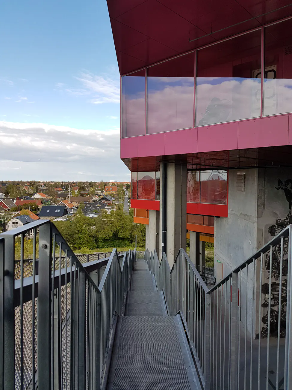 I was excited to discover a publicly accessible staircase which takes you to top of the mountain! The “underbelly” of the building is the parking garage, with the rainbow-coloured hallways of each floor spanning across.