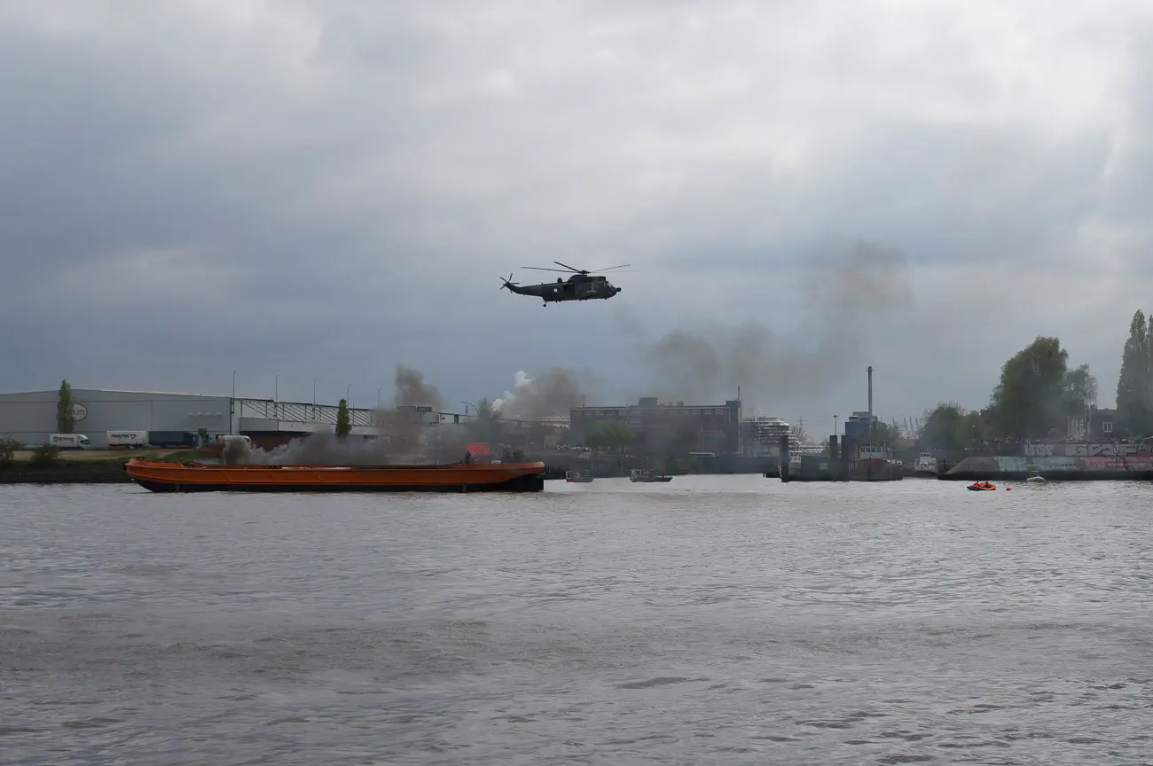 The St. Pauli port was filled with people. A sense of festivity and happiness was in the air, as the streets were closed to traffic and instead became a fairground – roller coasters, carnival games, shops, food trucks, you name it! We watched a demonstration of ship rescue with helicopters and speedboats. The “ship” (which is actually just a barge) is on fire, and first responders rushed to save everyone on the ship.