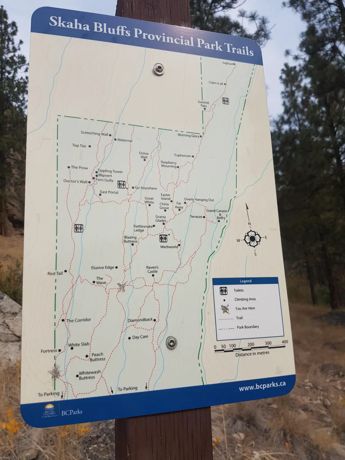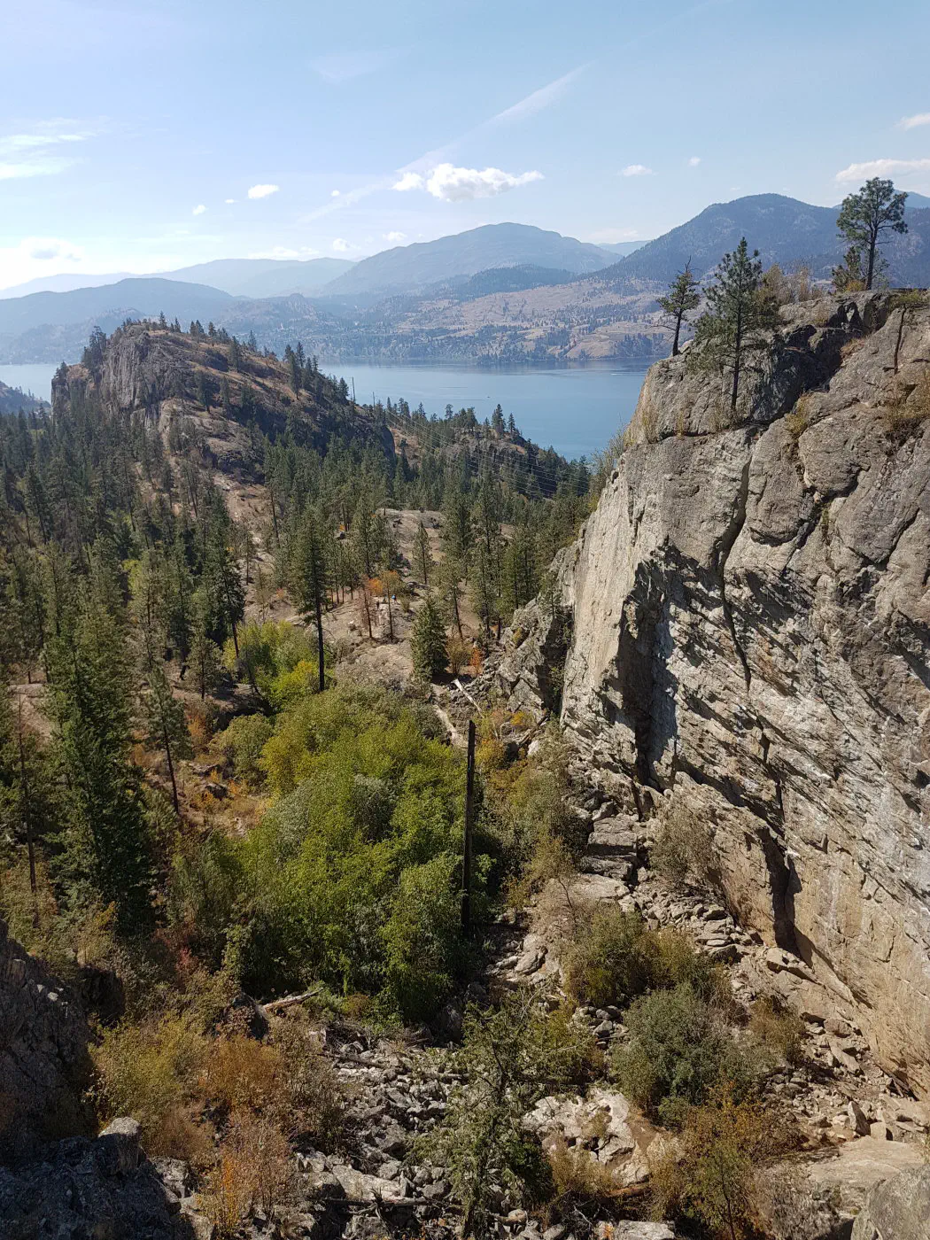 The approach from Skaha Bluffs parking lot to the walls is rather pleasant. The altitude increase is minimal, the path is very well-travelled, and generally has good visibility (for spotting bears).